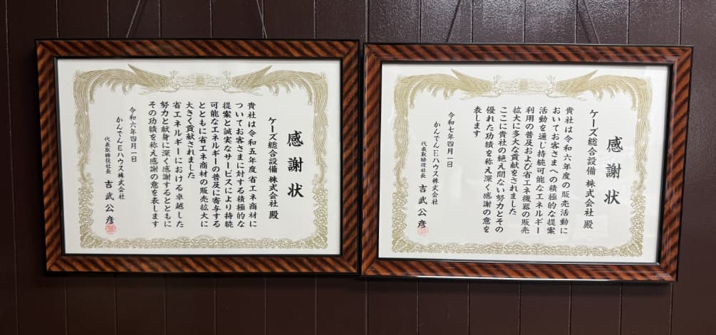 販売活動の功績を讃えられました! かんでんEハウス様から (関西電力グループ) 感謝状をいただきました!